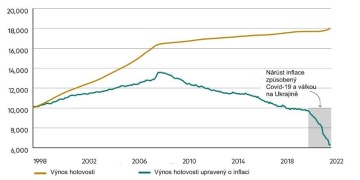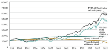 Obrázek 1: Výnosy z 10 000 GBP (tj. britská libra) v hotovosti před a po zohlednění vlivu inflace