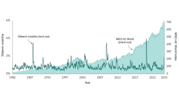 Poznámka: Světle zelená plocha ukazuje výkonnost indexu MSCI World Price Index od 1. ledna 1982 do 31. prosince 1987 a poté indexu MSCI AC World Price Index. Tmavě zelená křivka znázorňuje cenové výkyvy (volatilitu) indexu za předchozích 30 obchodních dnů. I když byly období, kdy volatilita prudce vzrostla, trh z dlouhodobého pohledu rostl.